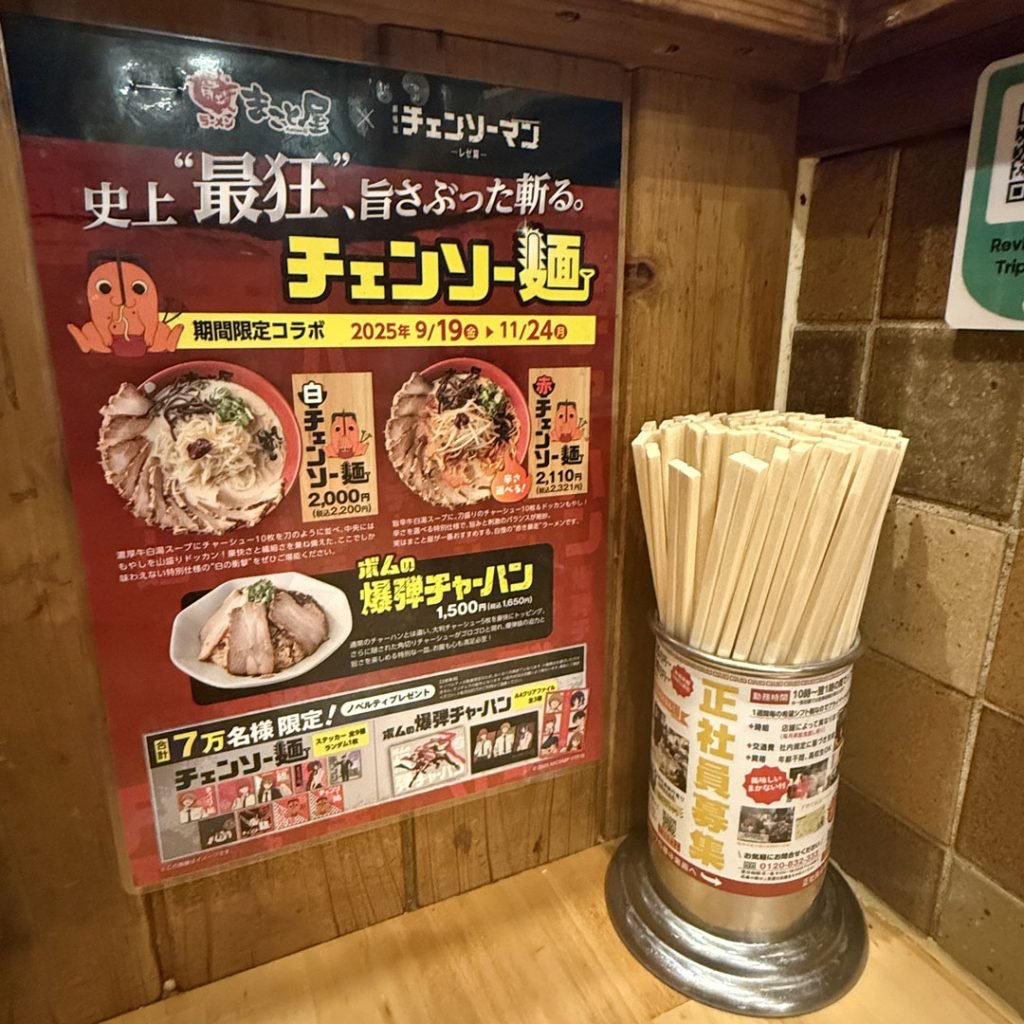 牛白湯スープのラーメンでおなじみ「まこと屋」では、公開日の9月19日から劇場版「チェンソーマン」とのコラボラーメンが販売されている。
