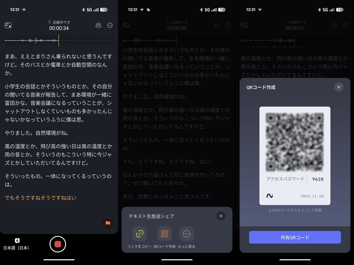 従来製品同様、離れた場所にいる人に文字起こしをリアルタイムで共有できる機能も利用可能。アプリの録音ボタンをタップして録音・文字起こし中に「テキストライブ」を選択すると、URLやQRコードで文字起こしをリアルタイム共有できます。送られた人はブラウザでリアルタイムに文字起こしや翻訳を参照でき、同時接続で最大300人まで共有可能。