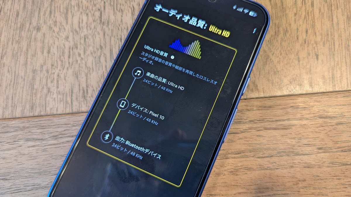 イヤホンとしての機能も充実。ハイレゾ音源の再生に対応し、LHDC対応のスマートフォンであれば最大24bit/96kHzの高音質で再生ができます。手持ちのPixel 10では、24bit/48kHzのUltra HD音質でAmazon Musicの再生ができることを確認しています。