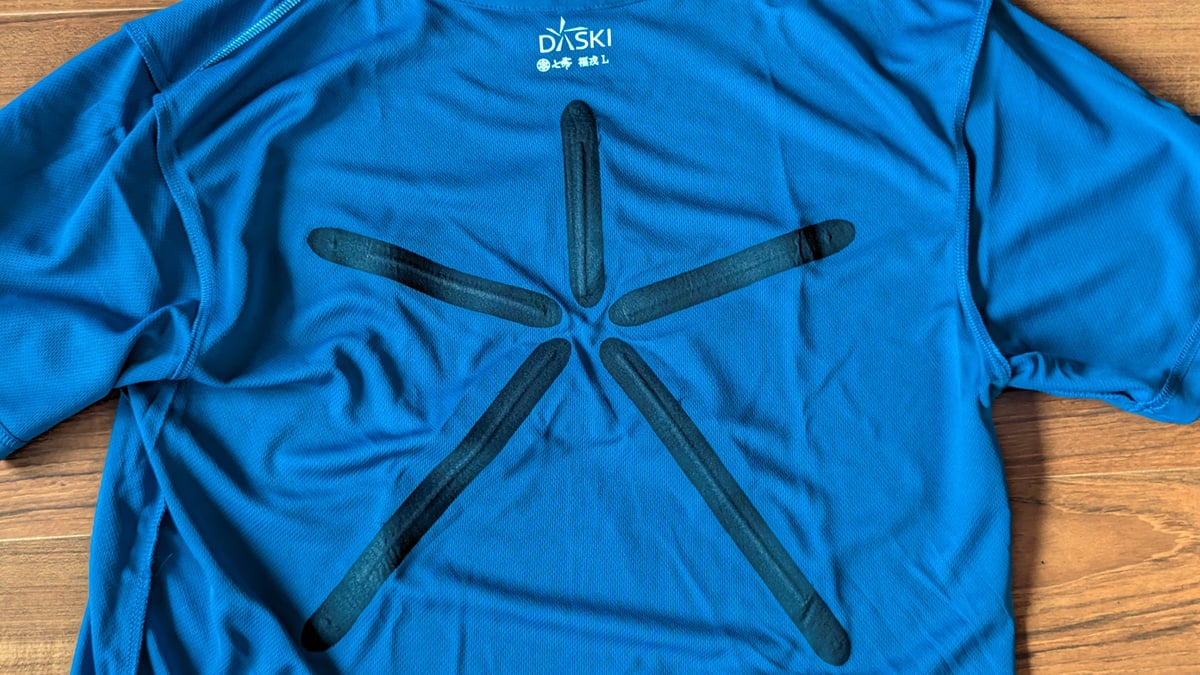 DASKIは一見、普通のTシャツですが、背中にある5本の刺しゅう線がたすき掛けと同等の作用をもたらす機能性ウェア。刺しゅう線の角度と長さ、張力が筋膜を刺激し、着たり羽織るだけですぐに効果が得られるとしています。鉱物による遠赤外線やテーピングによる加圧ではなく、刺しゅう線だけで効果が得られるのがポイント。