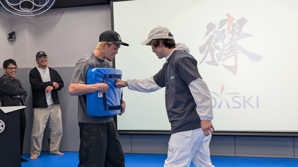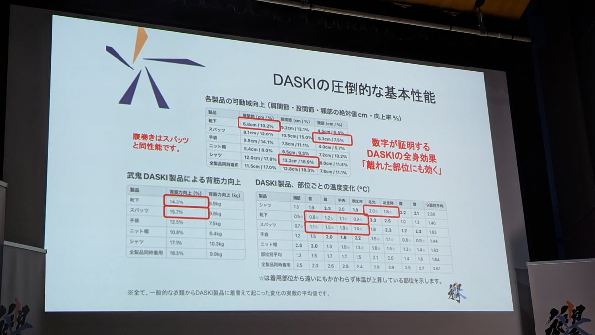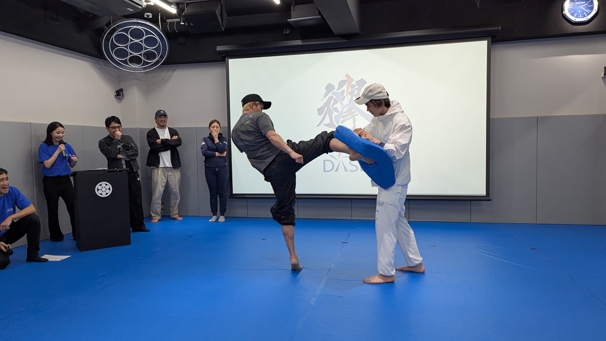 この福戎モデルの刺しゅう線を基本形として、張力を調整した派生モデルを開発。5月に開催された福戎モデルの発表会では、力仕事や格闘技、武術、競技に向けた全身の出力最大化を目的とした「武鬼(おに)」モデルを着用した格闘家が、着用の前後でキックやパンチの威力が上がることを確認するデモンストレーションが披露されました。
