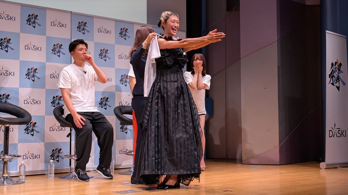 2025年7月に開催された白狐モデルの発表会では、モデルの山田優さんとお笑いコンビ・マユリカの2人が上半身をひねる動きや前屈により、着用の前後での可動域の向上を体感していました。