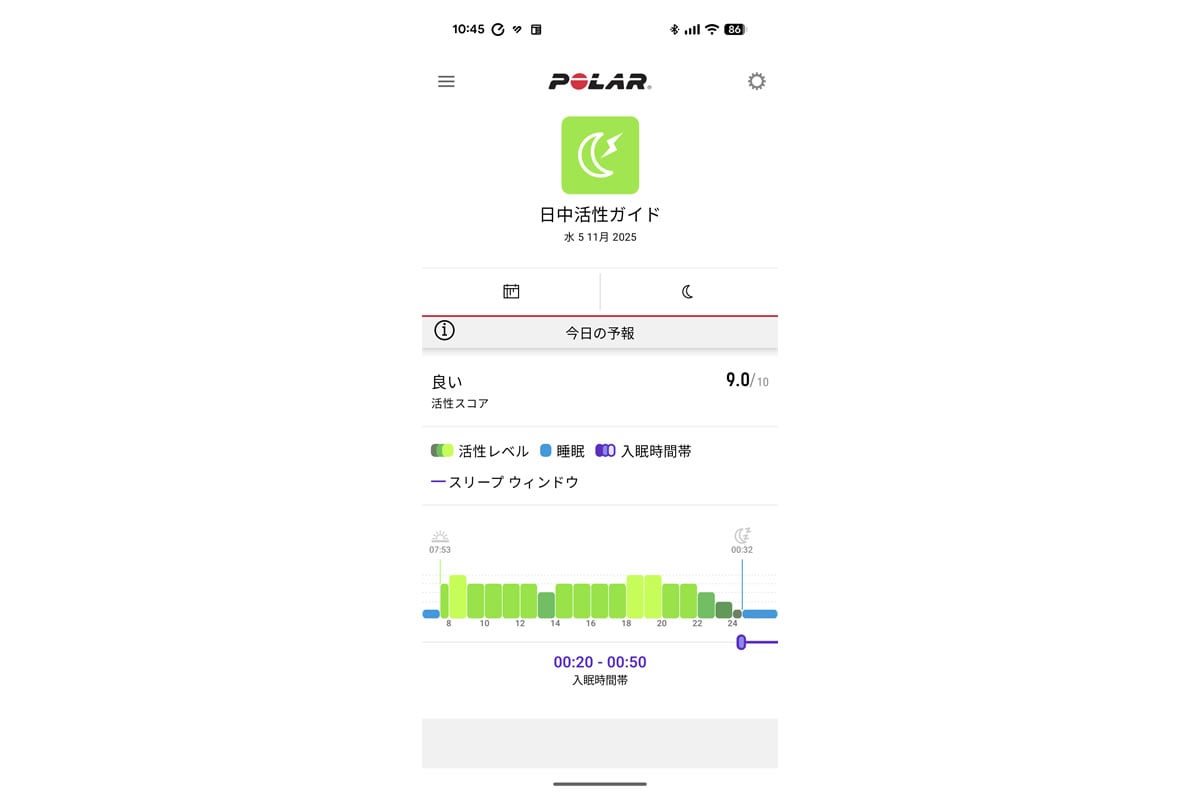 「日中活性ガイド」は、最近の睡眠から分析したユーザーの活性レベルをグラフ化して、おすすめの入眠時間帯を提示する機能。活性レベルが低いときに休息を取ったり、運動する時間帯を活性レベルが高いときに合わせるなど、活動を調整する目安になります。活動の成果は活性スコアとして確認が可能。
