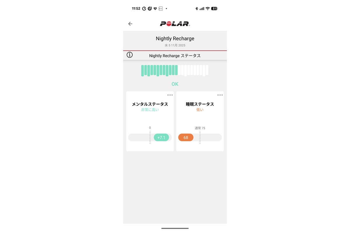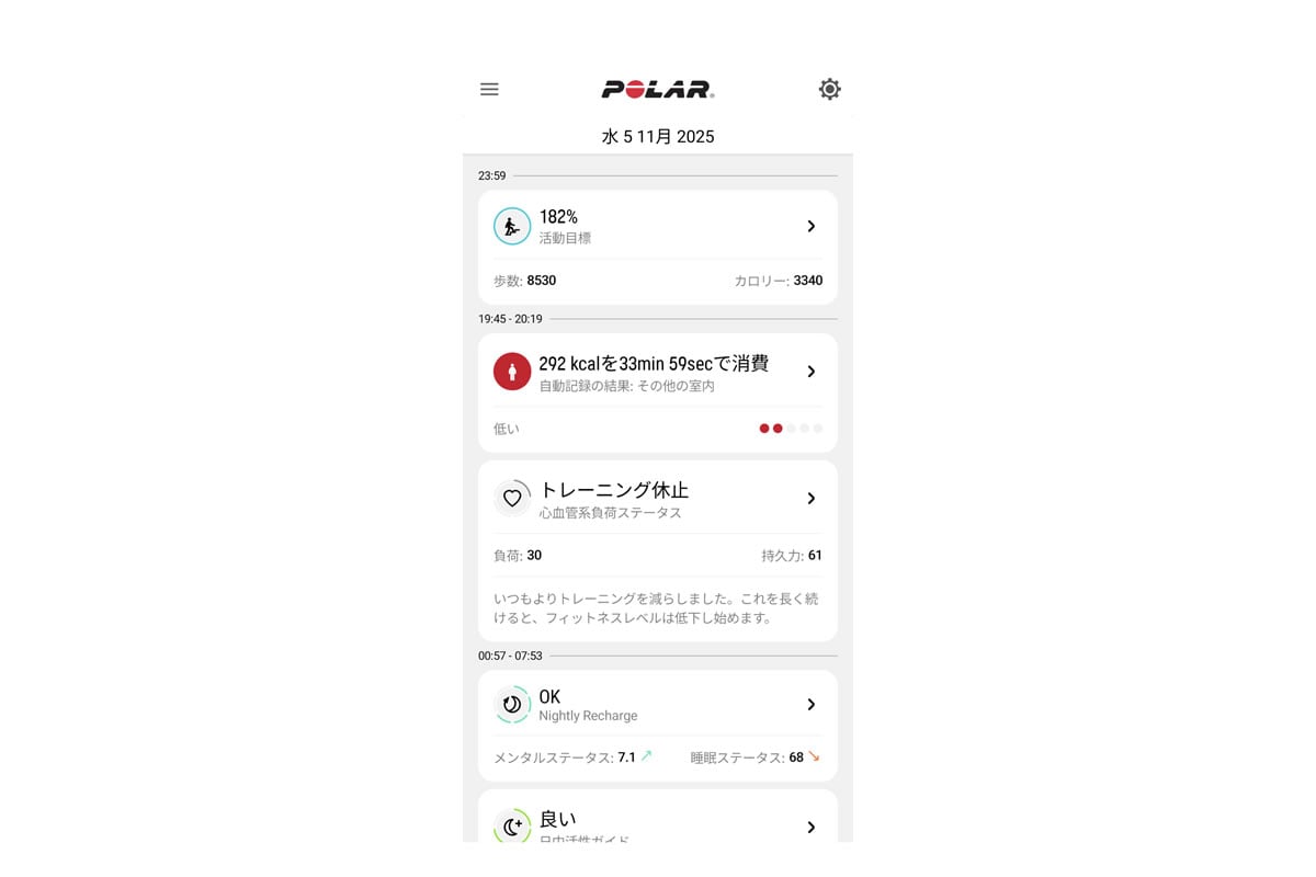 「Nightly Recharge」は、睡眠中のメンタルのスコアと睡眠スコアを一目で確認できる画面。しっかり回復できていたかどうかを「良い」「OK」「やや悪い」と評価してくれます。睡眠と回復の状態が一瞬で把握できるので、その日の就寝時刻の目安として活用しましょう。