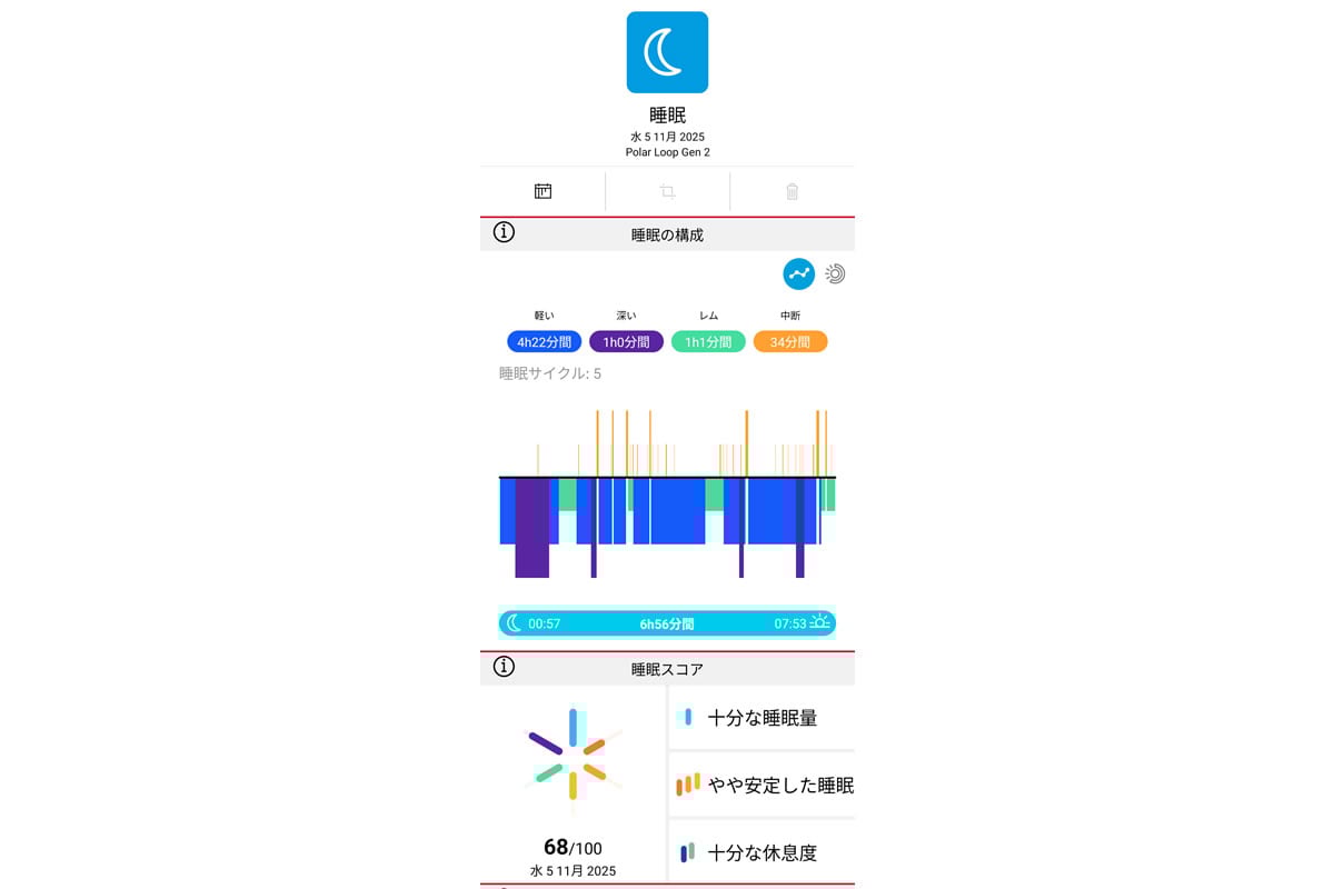 「睡眠時間」では、前日の詳細な睡眠ログを確認できます。「浅い睡眠」「レム睡眠」「深い睡眠」の睡眠ステージとサイクルが見られる他、睡眠量と睡眠の安定度、休息度から放射状のグラフで評価する睡眠スコアを確認できます。