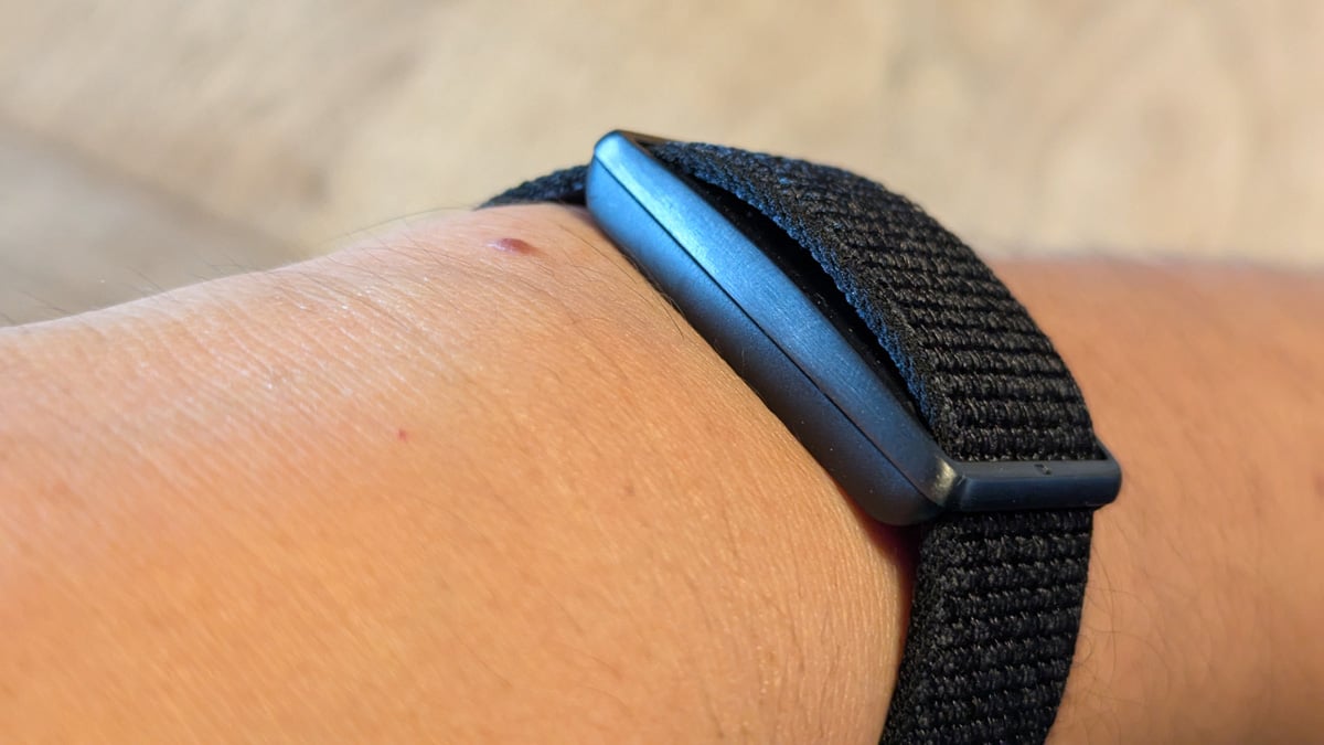 ファブリック素材のバンドを面ファスナーで留めて装着するシンプルなデザイン。本体は薄いフレームのような形状でバンドの下に隠れるので、スマートウォッチのように画面の表示や光が邪魔になることもなく、日常生活の中で自然に装着できます。重量はリストバンド込みで約29.5gと軽量。1日中装着していてもほとんど存在が気になりません。本体は30mの防水で水泳の際にもアクティビティが記録でき、日常で着けたまま洗い物をしても問題なし。