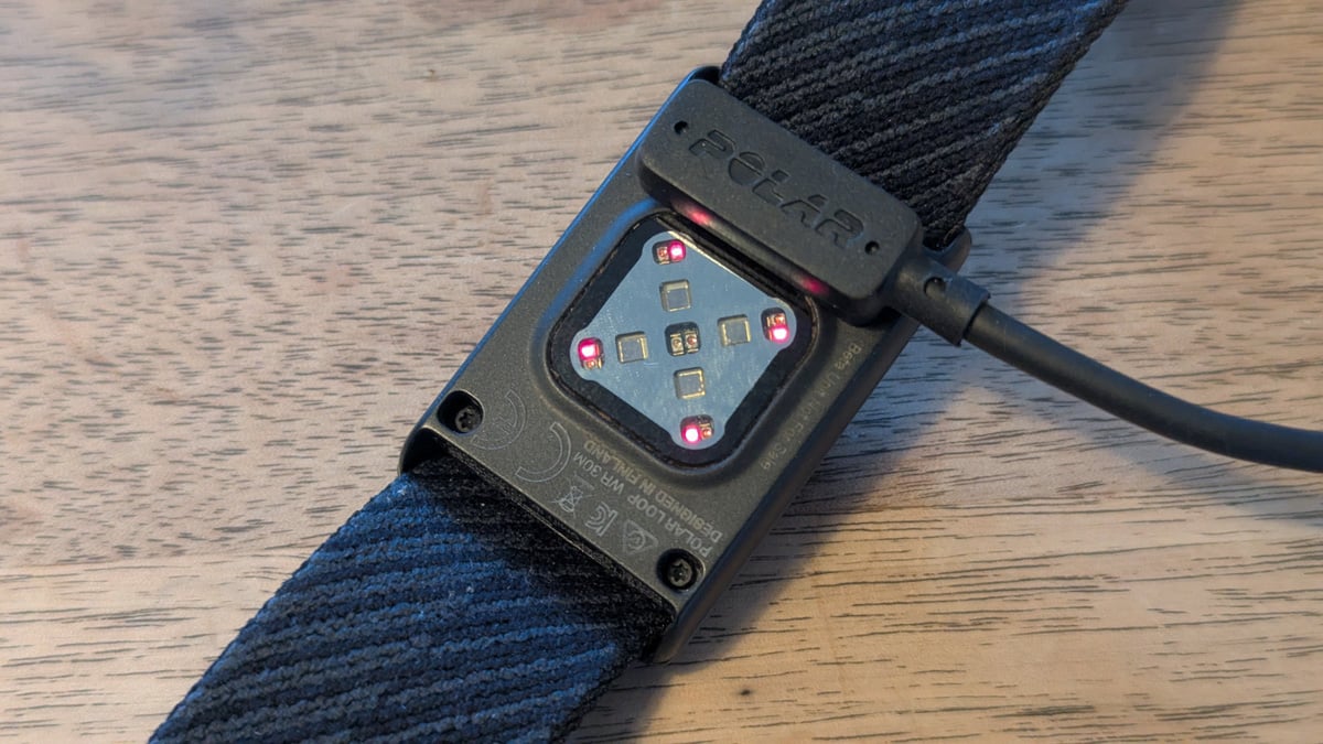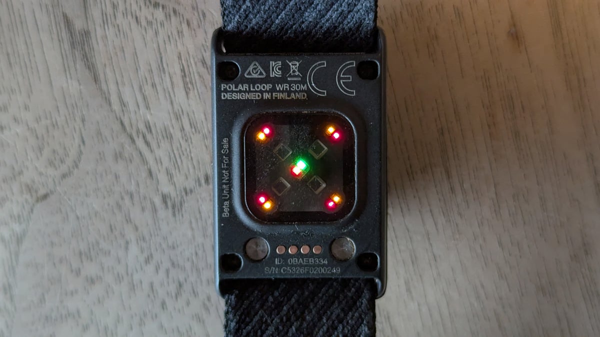 手首に触れる本体内側には、同社のスマートウォッチでも採用しているPolar Precision Prime心拍センサーを搭載します。赤・オレンジ・緑の3色、計10個のLEDが異なる深さの血管を検知、誤差を減らして精度の高い計測を実現しています。
