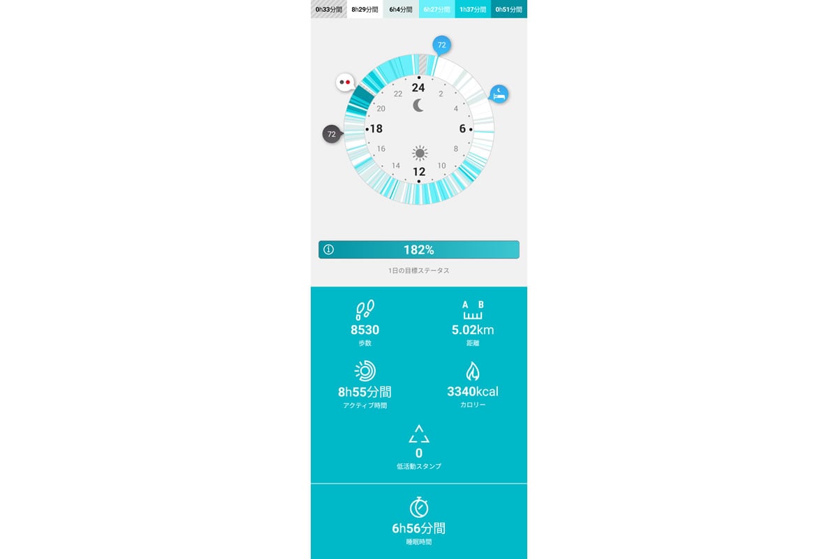 「活動量」は、歩数や移動距離、活動時間、消費カロリー、低活動の回数を数値で表示する他、1日の活動を円グラフにして活動の強度、心拍数の最低記録と最高記録を時間帯で確認が可能。円グラフはその日の活動強度の比率に表示を切り替えることができます。