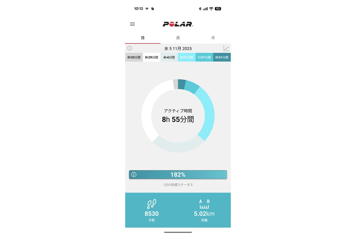 活動や睡眠の状況は、アプリのダッシュボードに一覧で表示。ここから「活動量」「トレーニング概要」「心肺運動負荷」「日中活性ガイド」「Nightly Recharge」「睡眠時間」の各項目で詳細を表示します。
