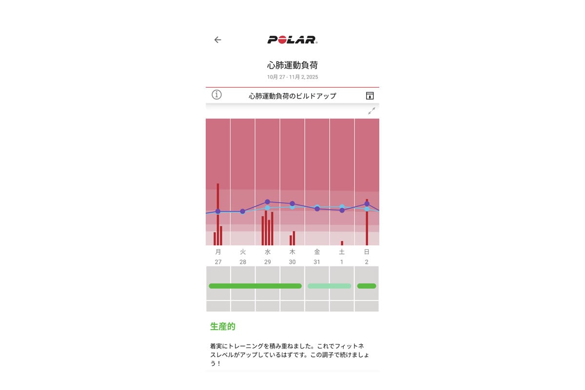 「心肺運動負荷」は、トレーニングセッションに対する心臓反応を示す指標。トレーニングの負荷を赤い棒グラフで表示、負荷の推移や心肺トレーニングへの耐性の推移も見ることができます。ジムに行って運動した日はトレーニング負荷が高くなっていましたが、「ジャパンモビリティショー」で1日会場を歩き回っていた日は棒グラフが並び、それなりに負荷がかかっていたことが分かりました。「今週はあまり負荷がかかっていないので、今日は1駅分歩こう」など、ジムに通う習慣がない人でも健康管理の指標にできるのではないでしょうか。