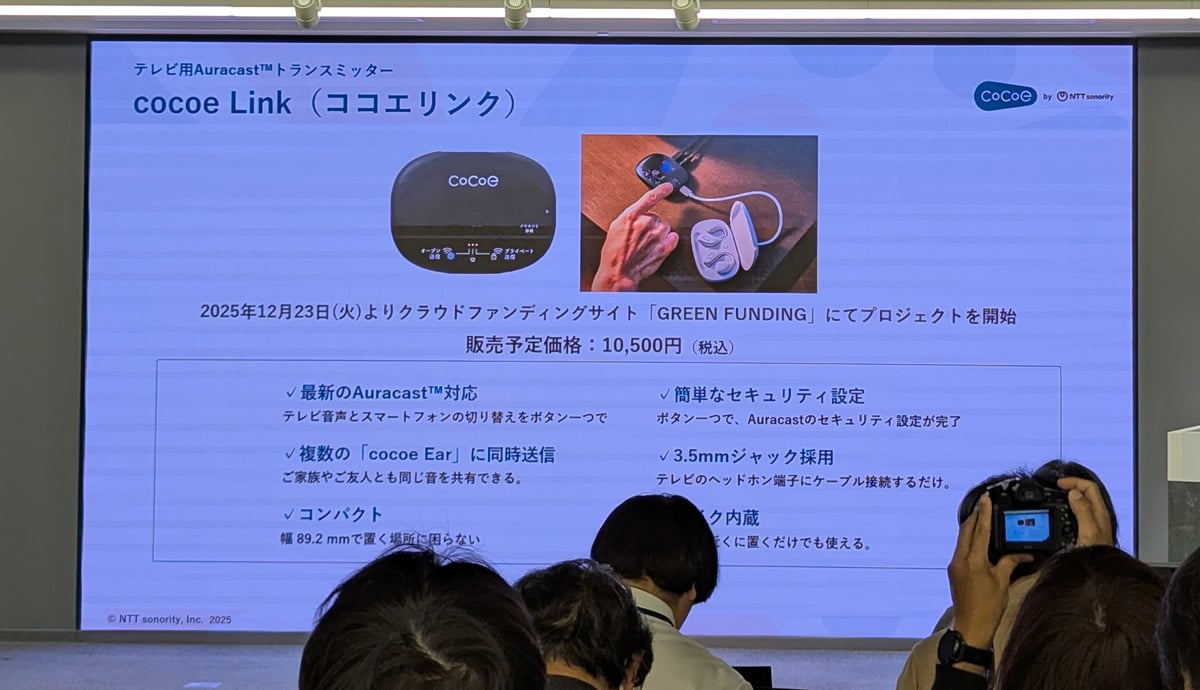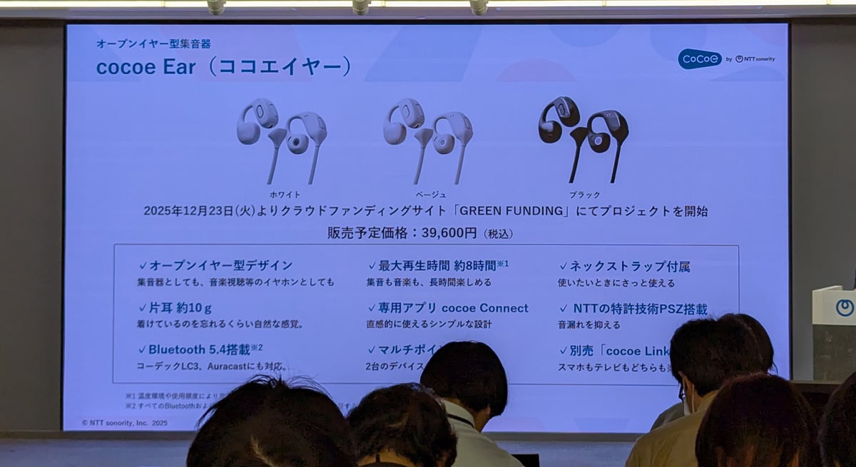 NTTとNTTソノリティは、加齢や生活環境により生じる耳の“聞こえづらさ”を解消し、会話や音を楽しむための新ブランド「cocoe(ココエ)」を発表。第1弾製品として、12月23日からGREEN FUNDINGでオープンイヤー型集音器「cocoe Ear」とテレビ用Auracastトランスミッター「cocoe Link」のクラウドファンディングプロジェクトを開始します。