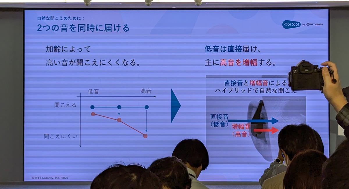 加齢による聞こえにくさでは、主に高音が聞こえにくくなることから、集音器を通して高音を増幅して聞かせ、低音はオープンイヤーで直接聞かせるというハイブリッドな音響設計を採用。