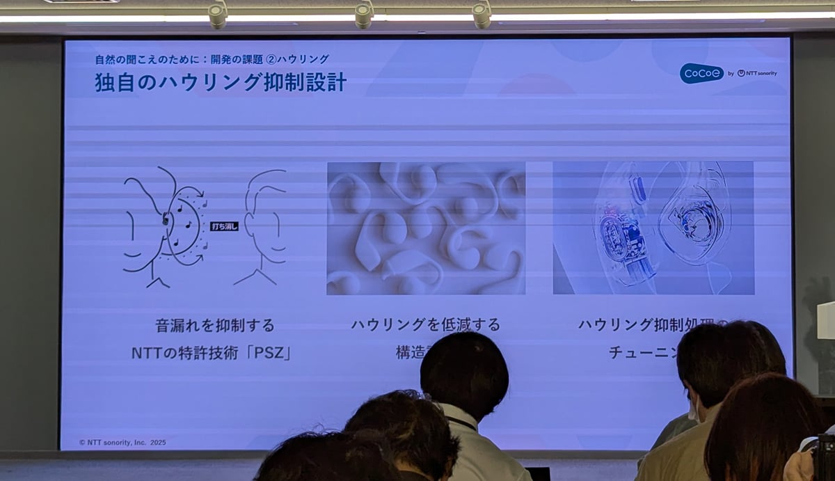 その際、増幅した音に遅延があると音が二重に聞こえる問題を高性能チップの採用により解消し、スピーカーから出た音をマイクが拾うことで発生するハウリングを、音漏れを抑えるPSZ技術と部品レイアウトの最適化、ソフトウェア上のハウリング抑制処理により解決しています。