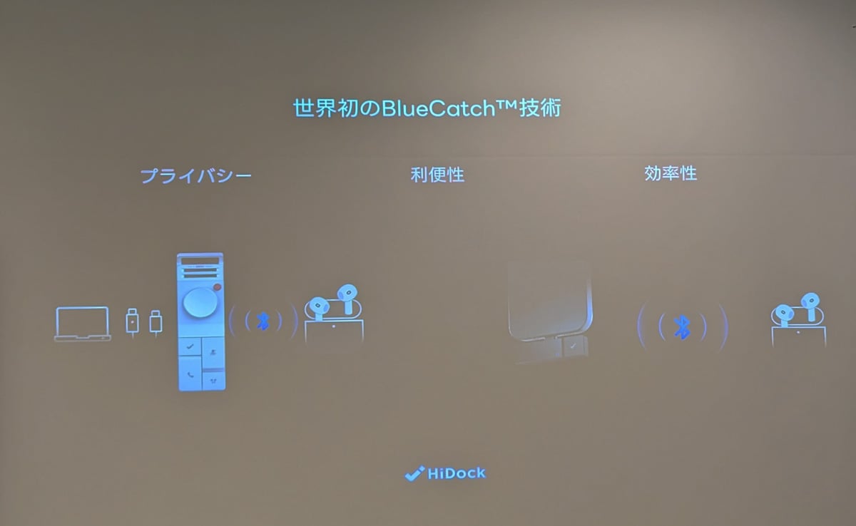 HiDock P1は単体でレコーダーとして利用できるだけでなく、USBケーブルでPCへ有線接続した本体に独自のBlueCatch技術で自分の好きなワイヤレスイヤホンを接続して、ビデオ会議や動画の音声を録音できるAIレコーダー。