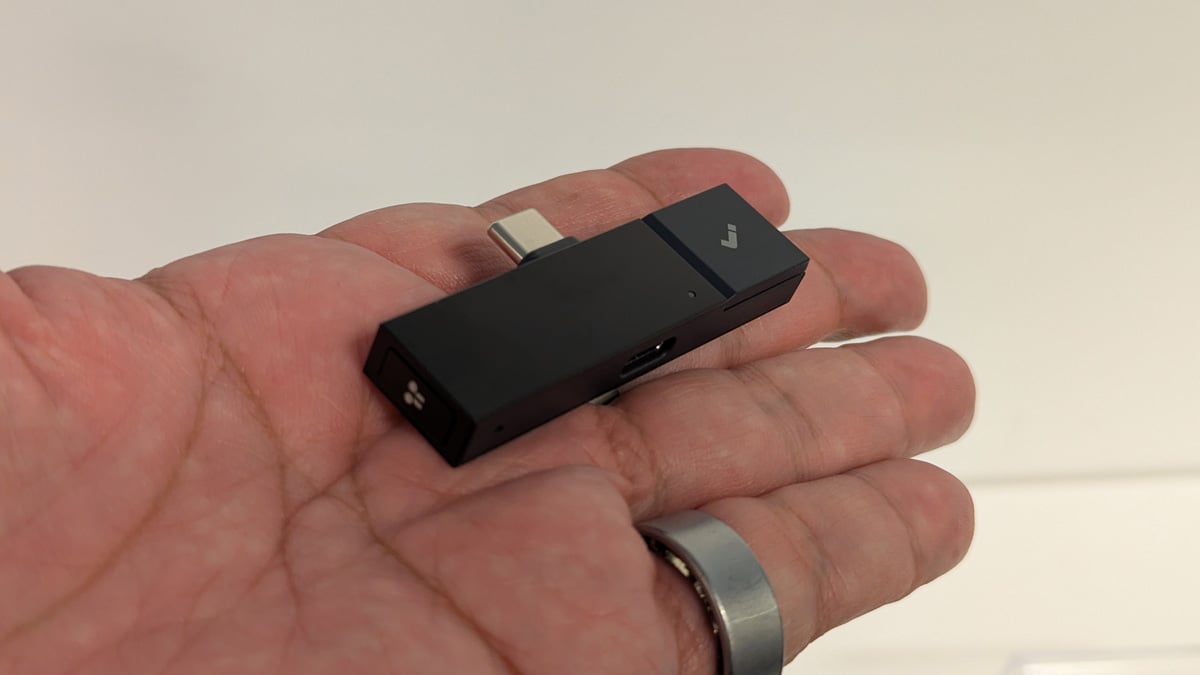 HiDock P1 miniはスマートフォン用に設計したHiDock P1のミニバージョンで、スマホのUSB-Cポートに差した本体がワイヤレスイヤホンと接続、通話やビデオ会議、動画の音声を録音できます。USB-Cポートを搭載し、スマホを充電しながら使うこともできます。