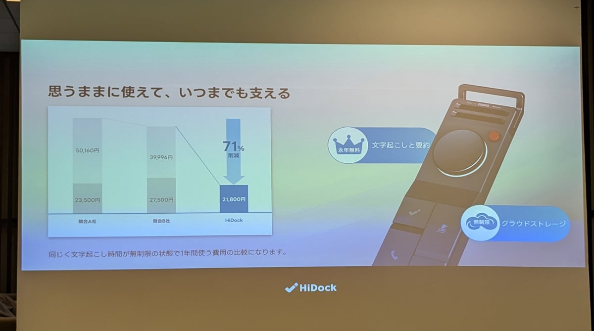 サブスクで機能を提供する他社製品に対して、HiDock初年度に本体の価格分のみ費用が発生することから、71%の費用削減になると説明しています。