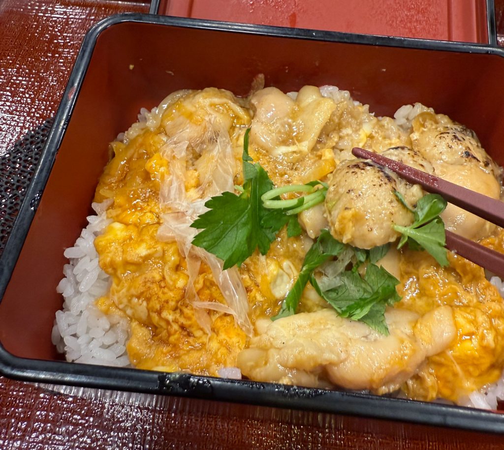 お重に入った親子丼。以前食べた「炭火やげん軟骨親子重」のときのお重と同じ仕様かな?