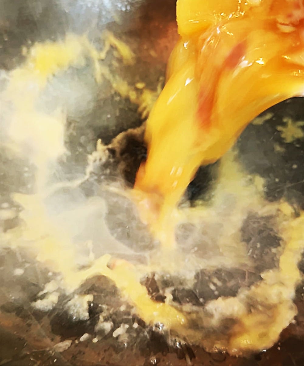 ということで、かつやの豚汁を家の鍋に召還して、グツグツに煮てヤケドするほどの熱さで飲んでみた。まず、かつやで豚汁(大)を2杯テイクアウトした。家に持ち帰り、極厚の中華鍋を徹底的にカンカンに加熱。そこに豚汁を流し込んだ。