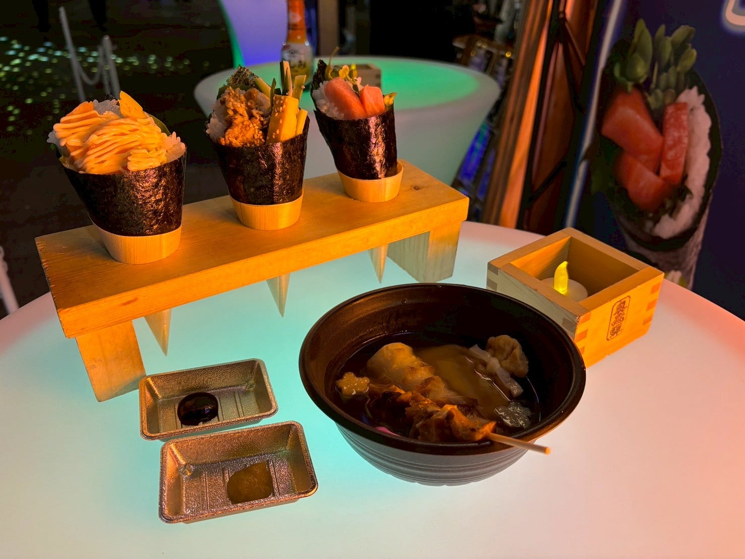 会場内には、イルミネーションの世界観をそのまま体現したキッチンカーも登場。手巻き寿司など江戸の食文化を感じさせるメニューをはじめ、クレープなどの東京・新宿にゆかりのあるグルメが楽しめる屋台が並び、目でも舌でもイベントの雰囲気を味わえる空間になっています。