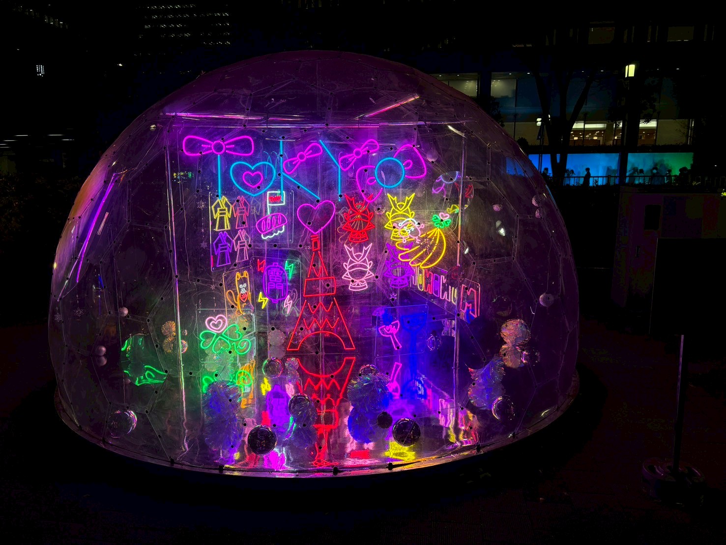 こちらの透明な半球体ドーム作品は、「Shinjuku Neon Walk」とテレビ朝日で放送中の人気番組『ももクロちゃんと!』のコラボレーションによるもの。ももいろクローバーZのメンバーそれぞれが「東京&カワイイ」をテーマに描いたイラストを、ネオンアートとして立体的に再現しています。