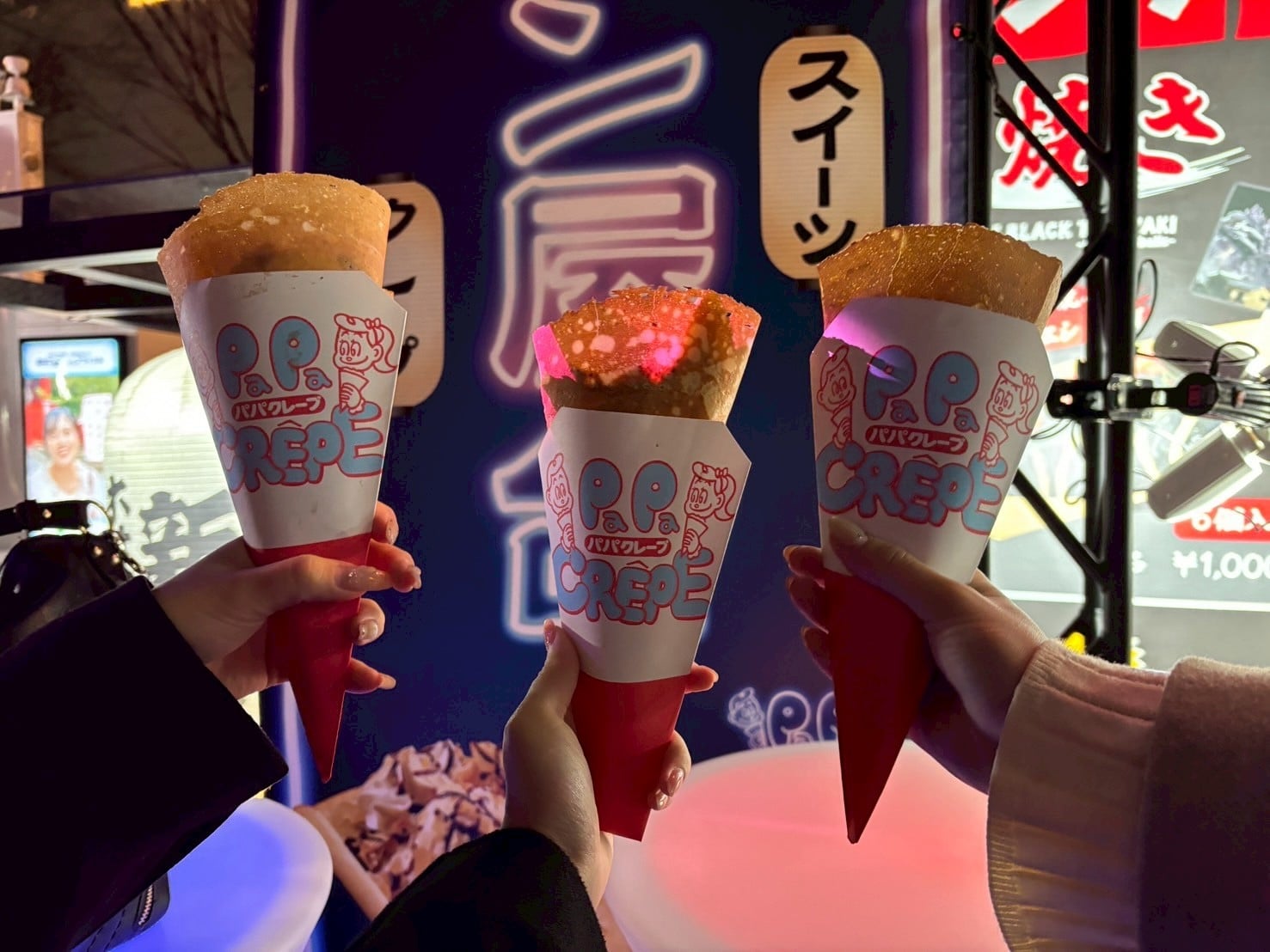 光に包まれたネオンの中でいただくフードは、いつもの屋台グルメとはひと味違った特別感があり、散策の合間につい立ち寄りたくなるポイントです!