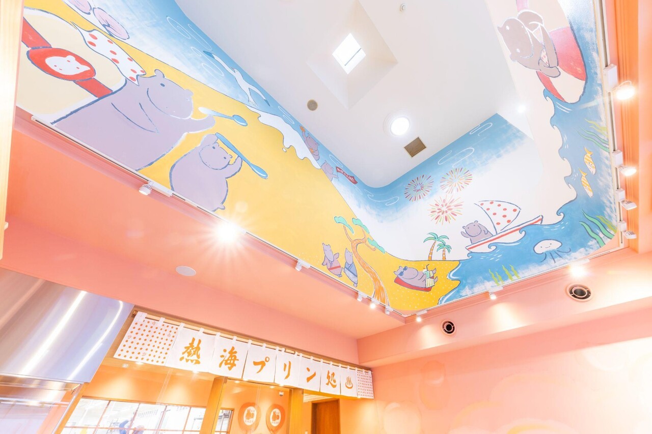 熱海プリンファクトリーは、熱海プリン6店舗目となる新店舗。“レトロな大浴場”がテーマの店内は、遊び心がたっぷり。暖簾をくぐると熱海の景色が描かれた壁にタイル張りの浴場を再現したベンチ、実は、イートインスペースで8人座れます。まるで昭和の温泉に迷い込んだような、どこか懐かしくて、思わずあちらこちらで写真を撮りたくなる空間です。